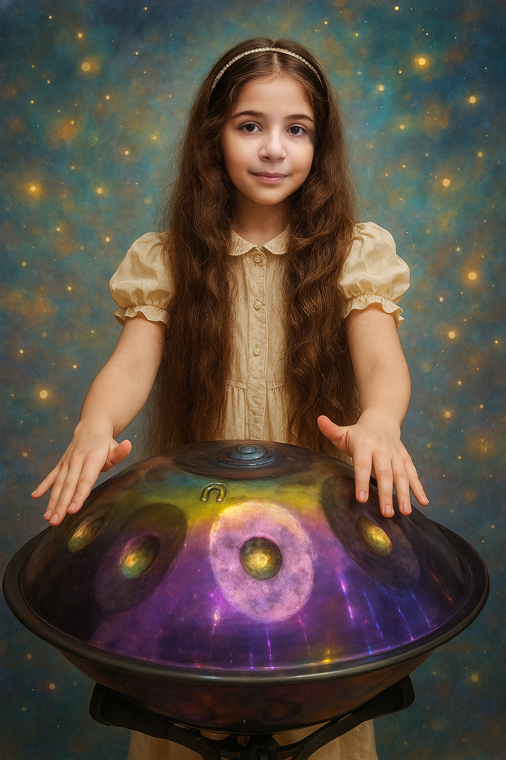 آوا علیپور فتحکوهی، با دستانی کوچک اما پر از احساس، هنگدرام را مینوازد؛ سازی که انگار از دل آسمان آمده تا آرامش را به زمین هدیه کند.